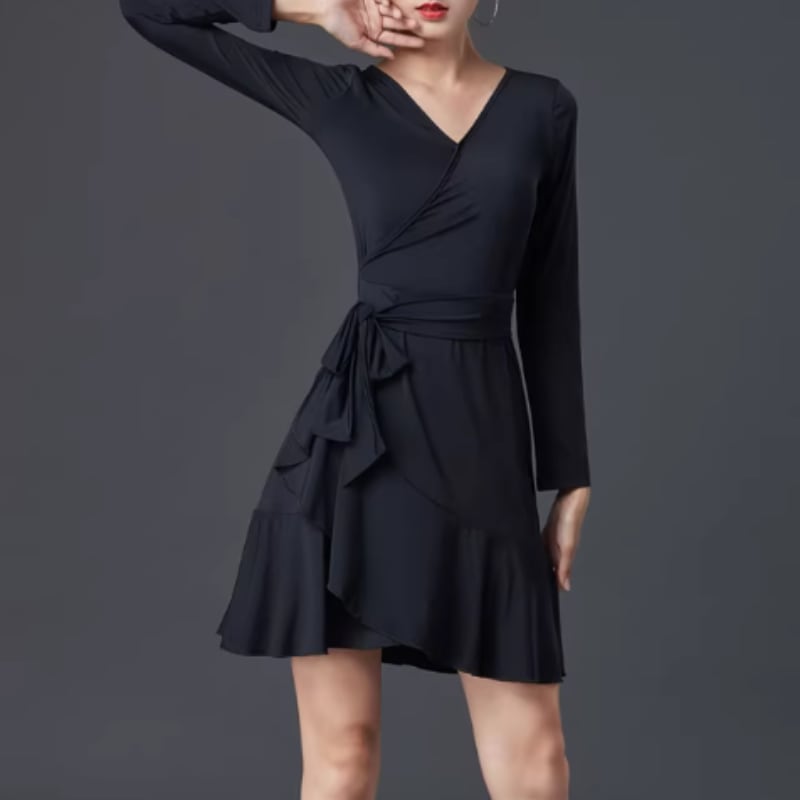Vネックとラッフルフリルが女性らしいミニ丈ワンピース。Aラインシルエットで体型カバーも叶え、どんな動きにも対応できる快適な着心地です。パーティーやダンスなど華やかなシーンで活躍する、一枚持っておきたいアイテムです。ウエストのリボンでスタイルアップ効果も◎