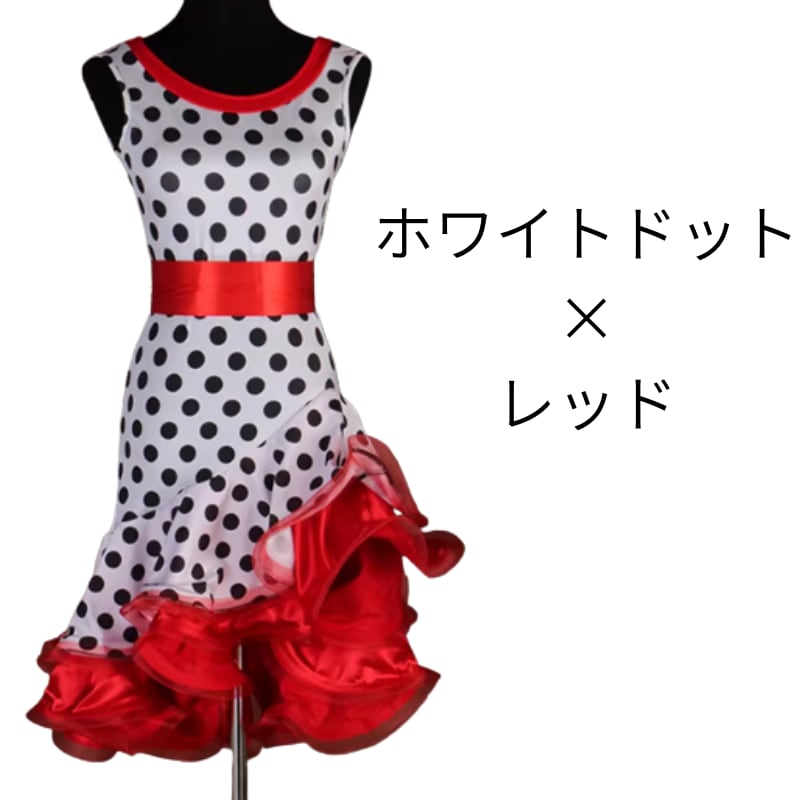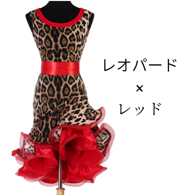 レオパード柄とレッドのフリルが情熱的なノースリーブワンピース。大胆なアニマル柄が個性を際立たせ、レッドのティアードスカートが華やかさをプラスします。ウエストのベルトがスタイルアップ効果も◎。社交ダンスやパーティーシーンで、主役級の存在感を放つ一着です。