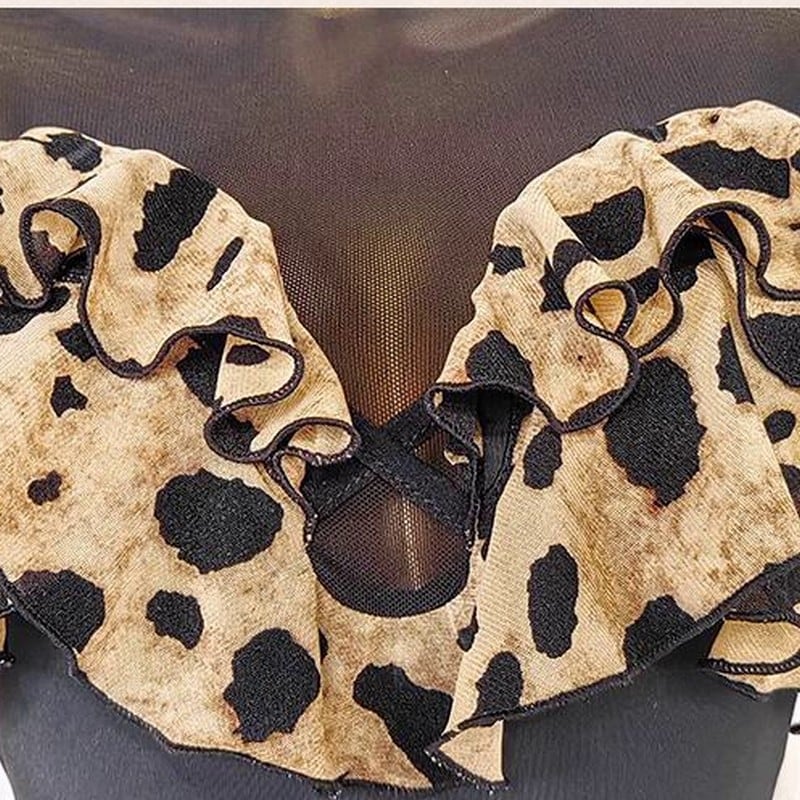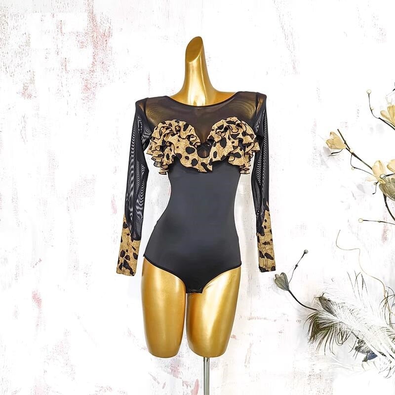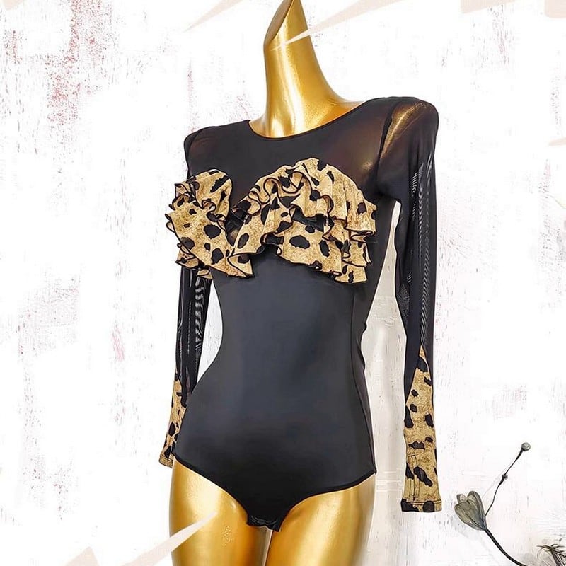 大胆なアニマル柄フリルが胸元に映える、個性派ダンスレオタード。