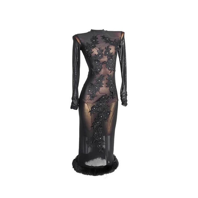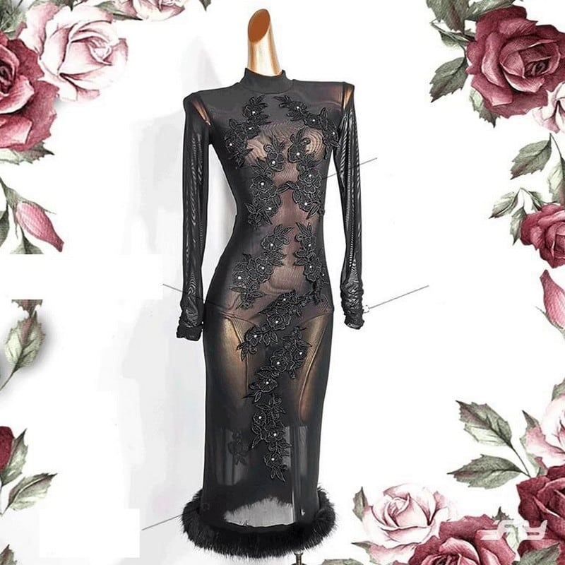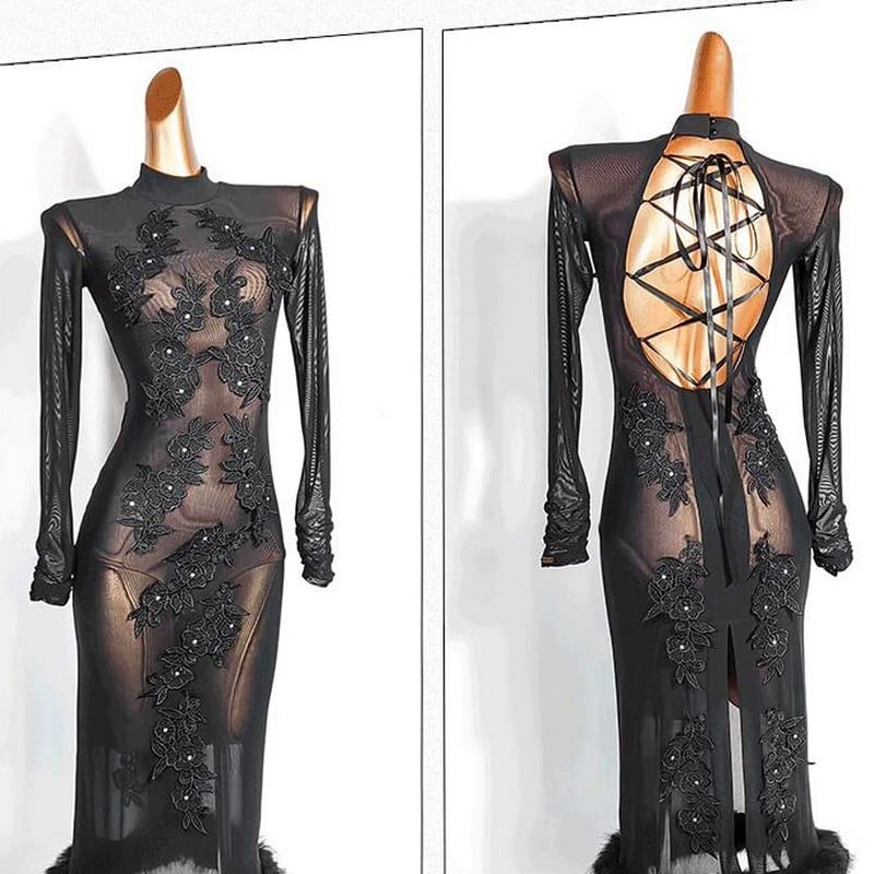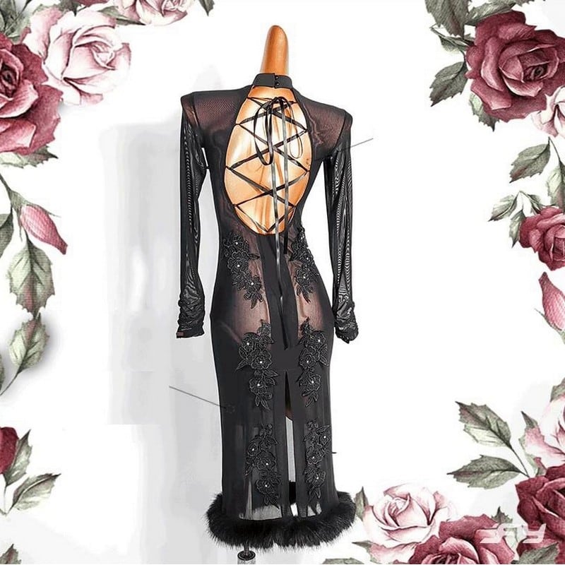 魅惑的な透け感と大胆なバックシルエットが印象的なロング丈ラテンドレス。