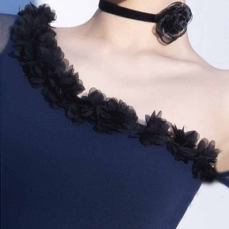 上品なネイビーにフラワーデコルテが咲く、片肩デザインのラグジュアリートップス。