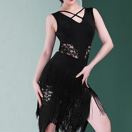 鮮やかなカラーが目を惹く、ノースリーブのダンスドレス。胸元のクロスデザインとウエストのレースが、上品なアクセントを添えます。裾にあしらわれたフリンジが、踊るたびに美しく揺れ、情熱的なラテンの雰囲気を演出します。