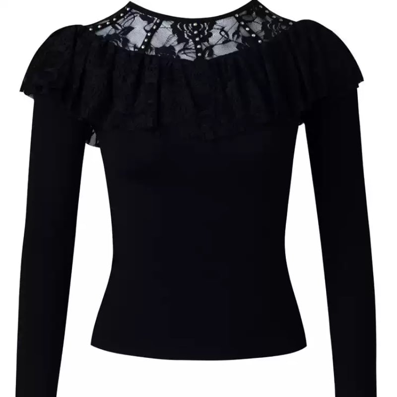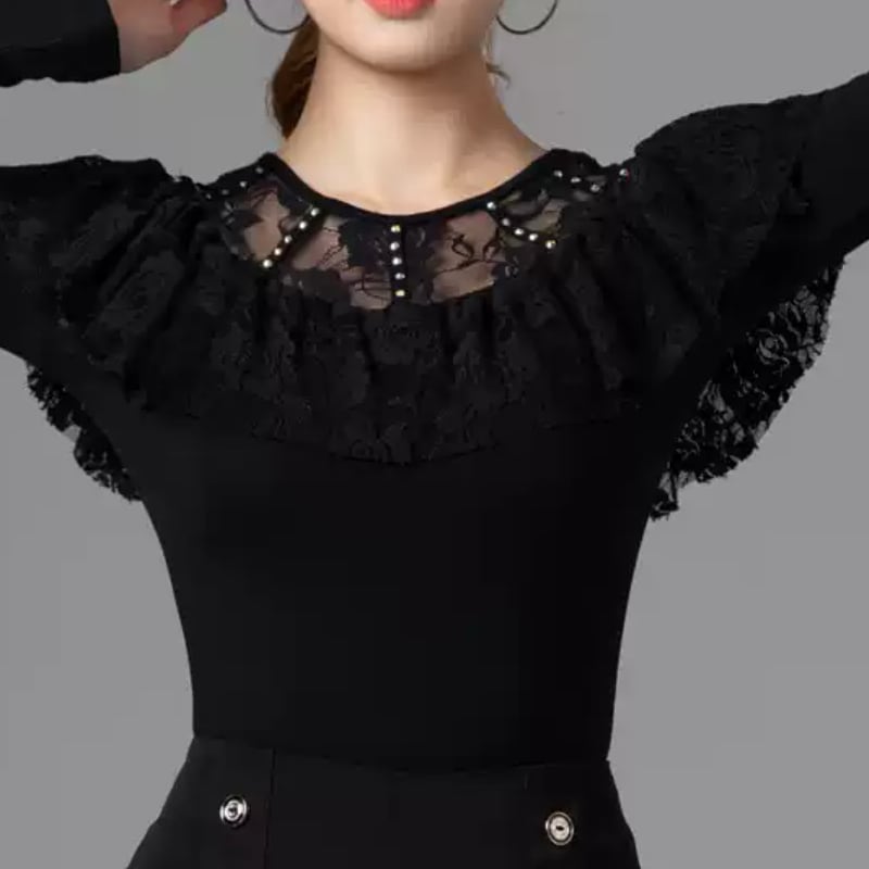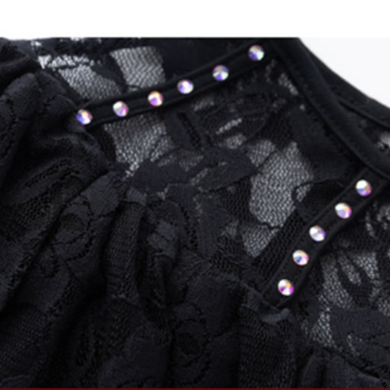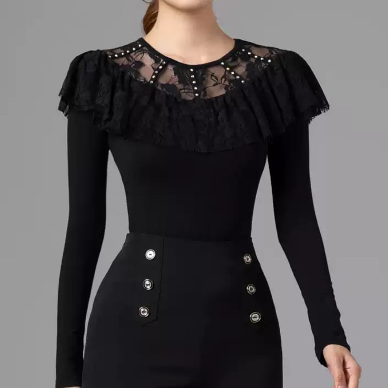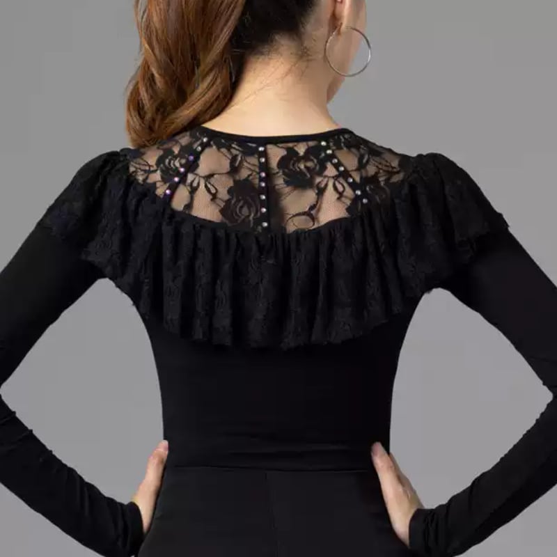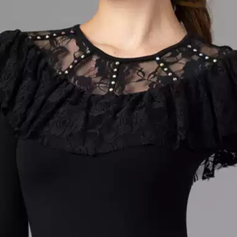 胸元を飾る繊細なレースが、上品な印象を与えるダンストップス。