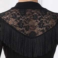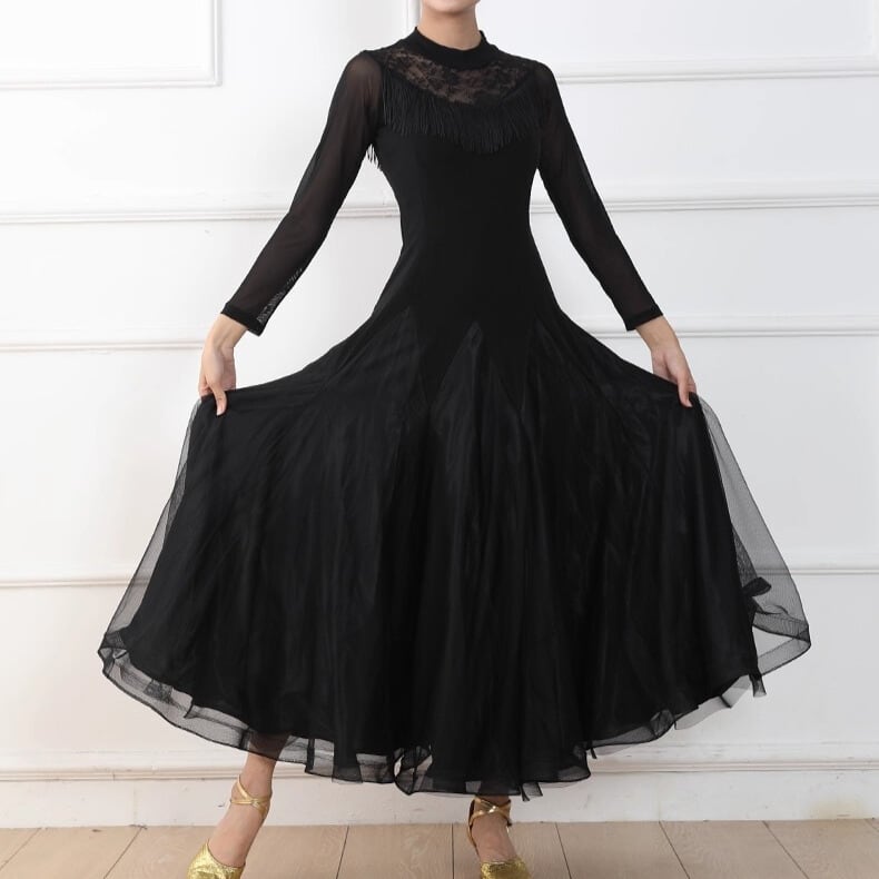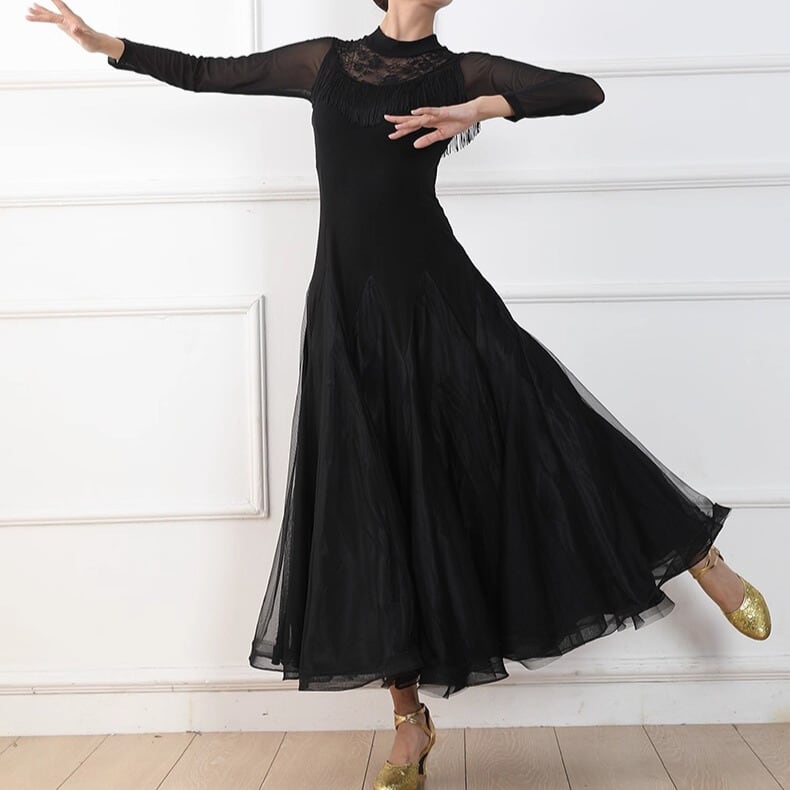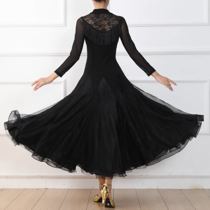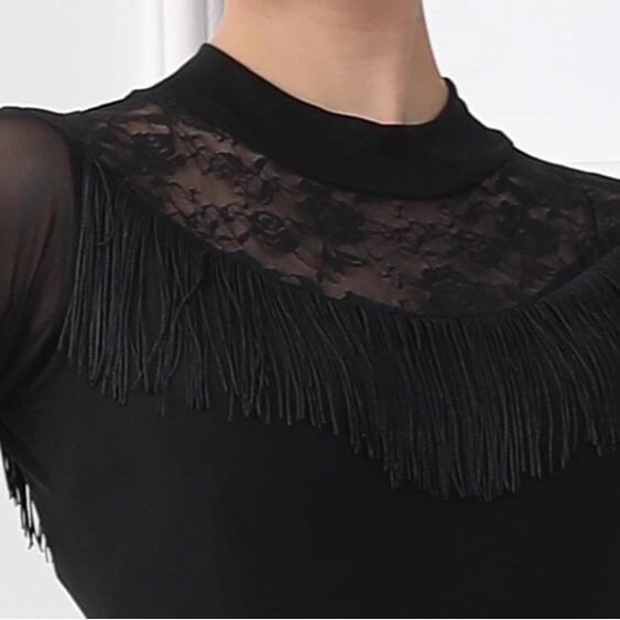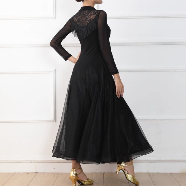 首元のレースと胸元のフリンジが上品さを演出する長袖ミモレ丈ダンスドレス。