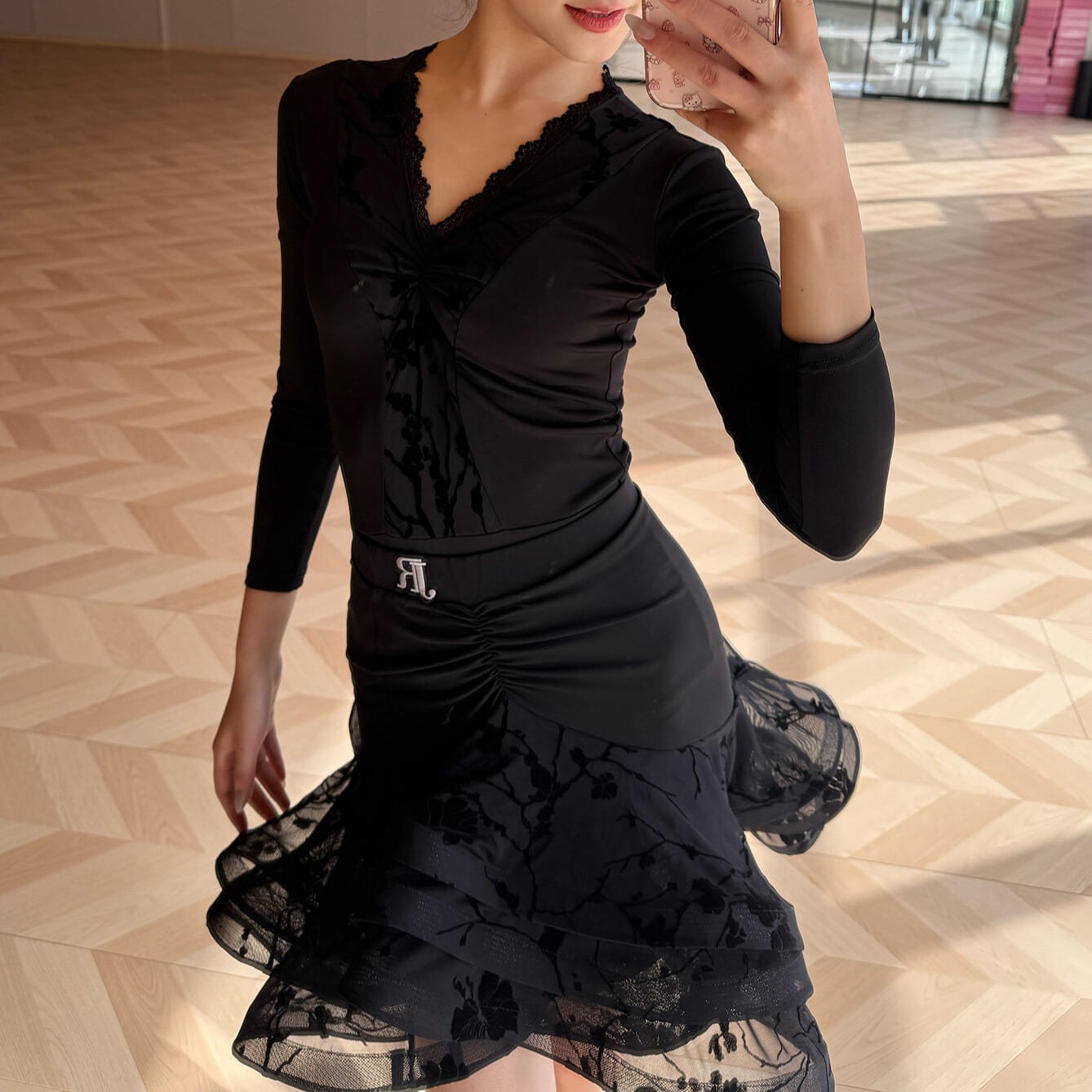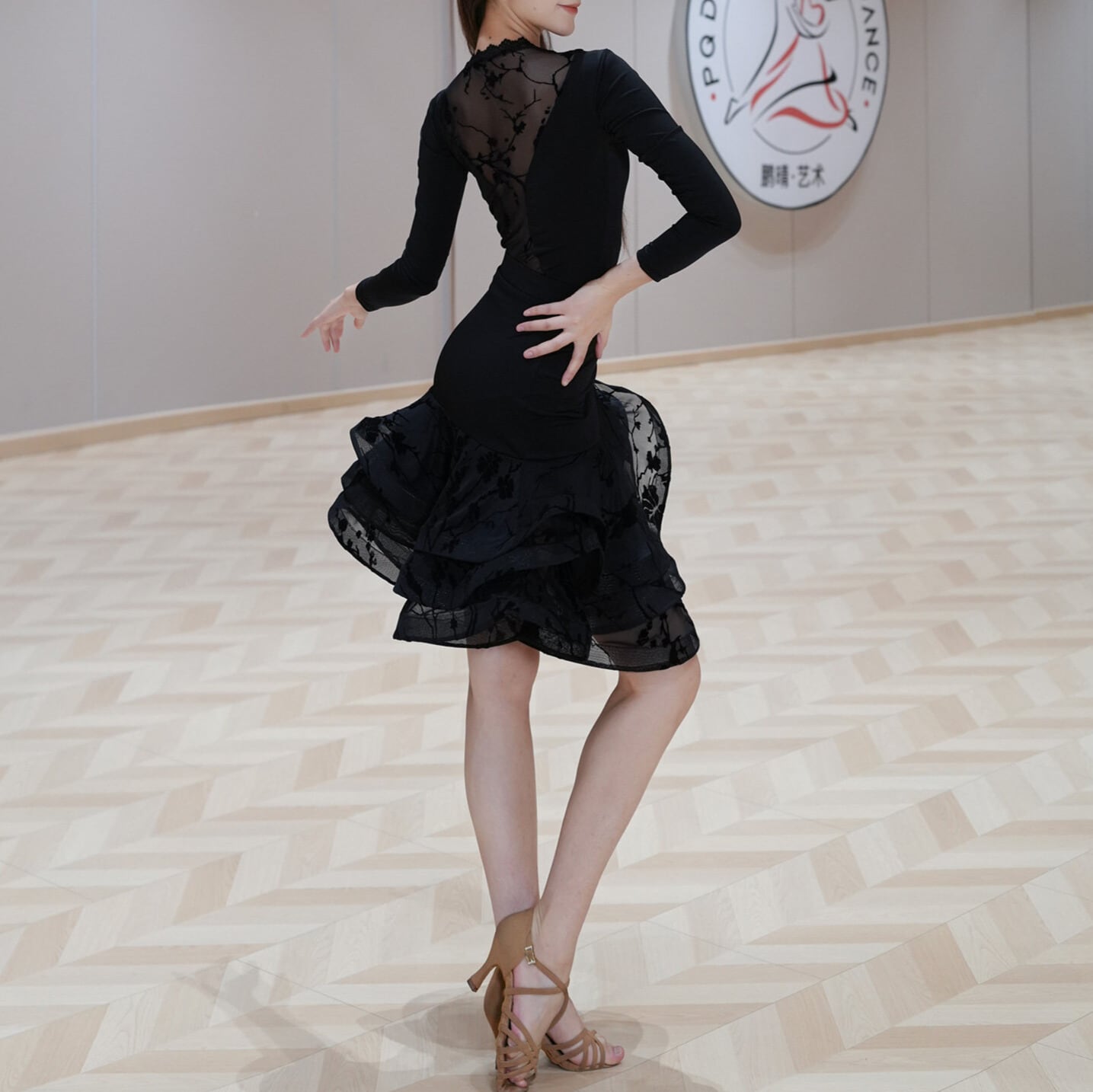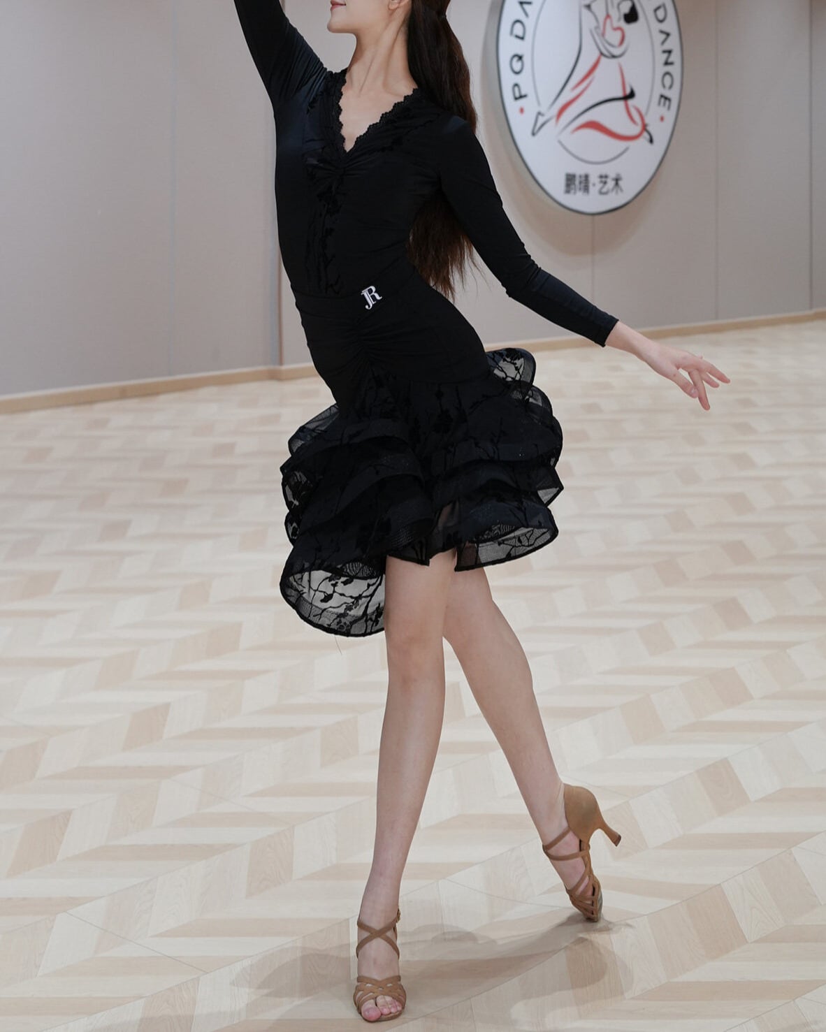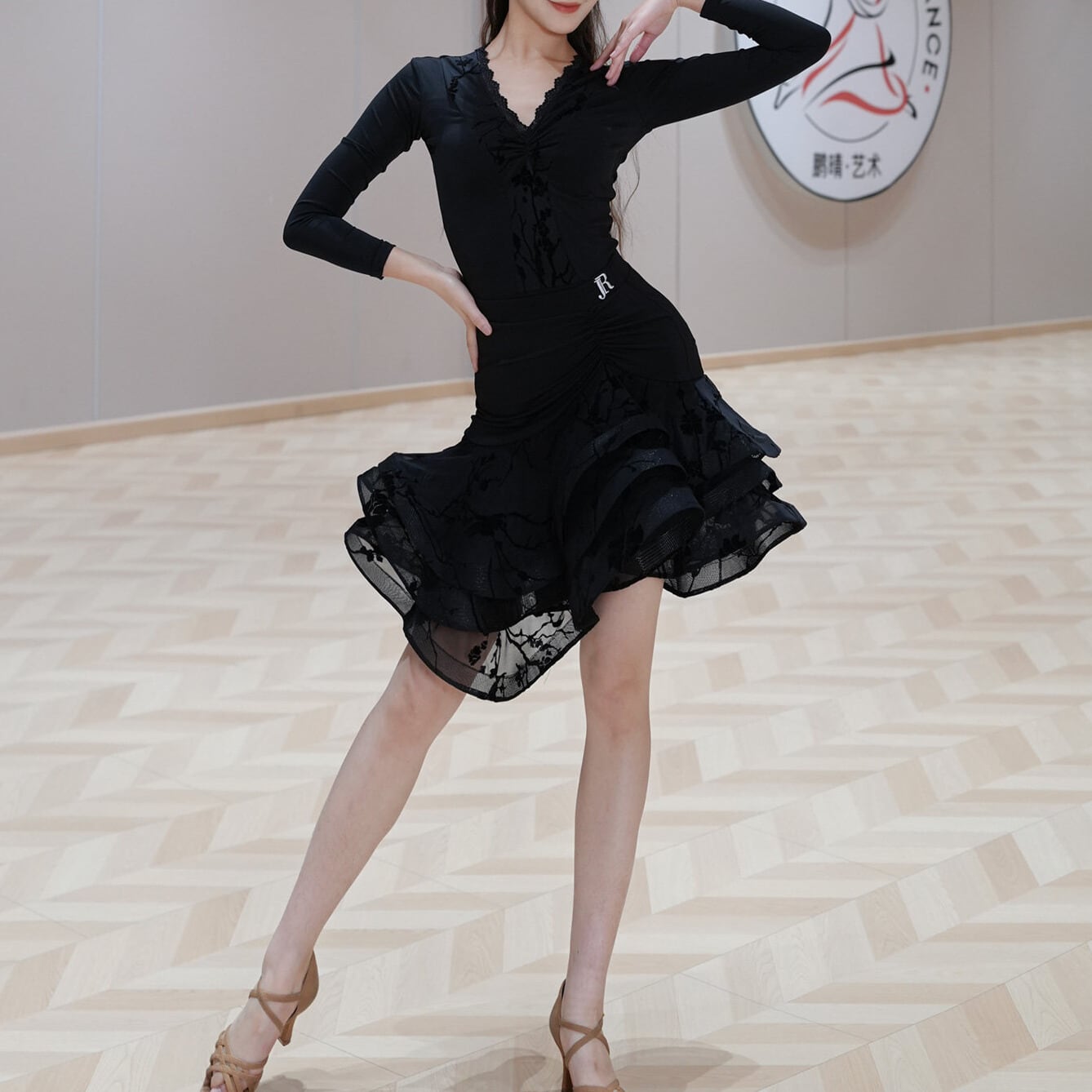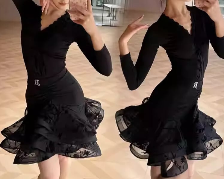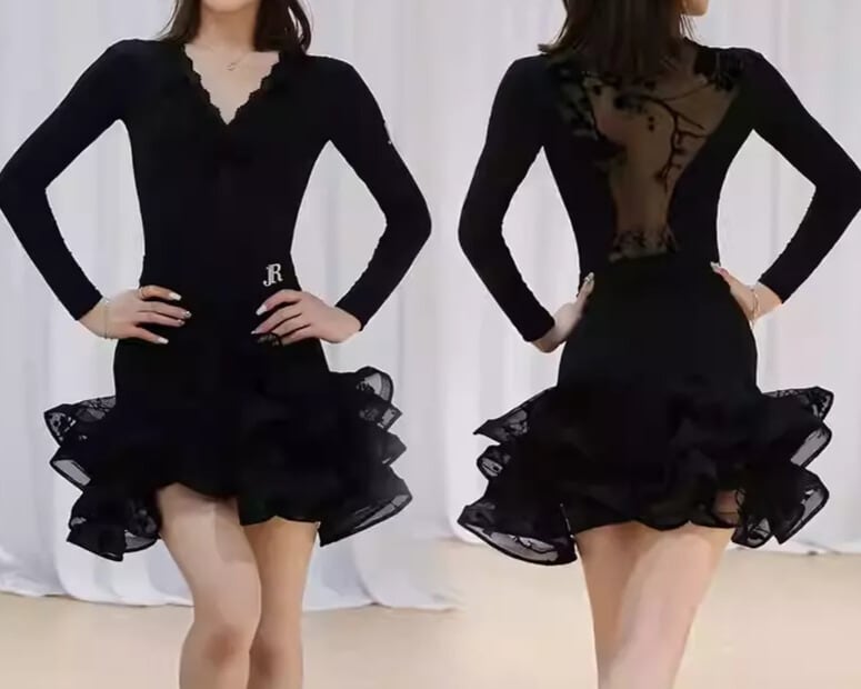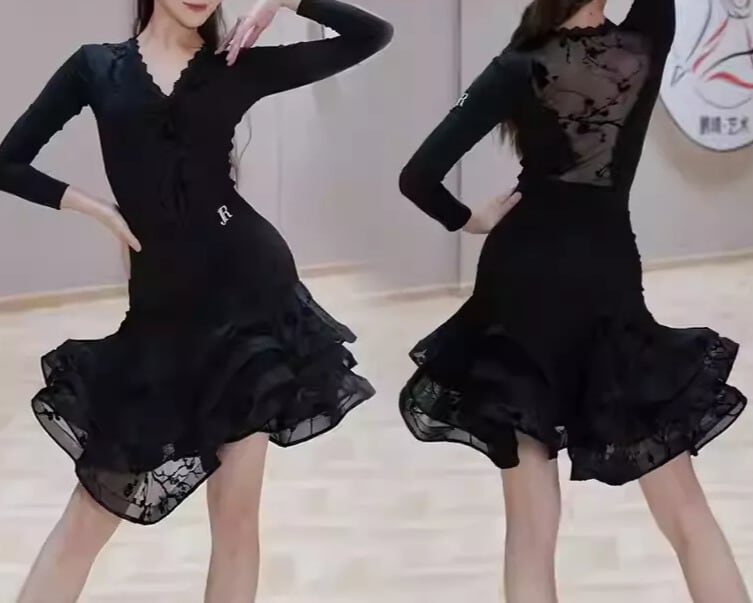裾にかけて広がるフリルが、華やかさを添え、ダンスの動きをより一層美しく引き立てます。