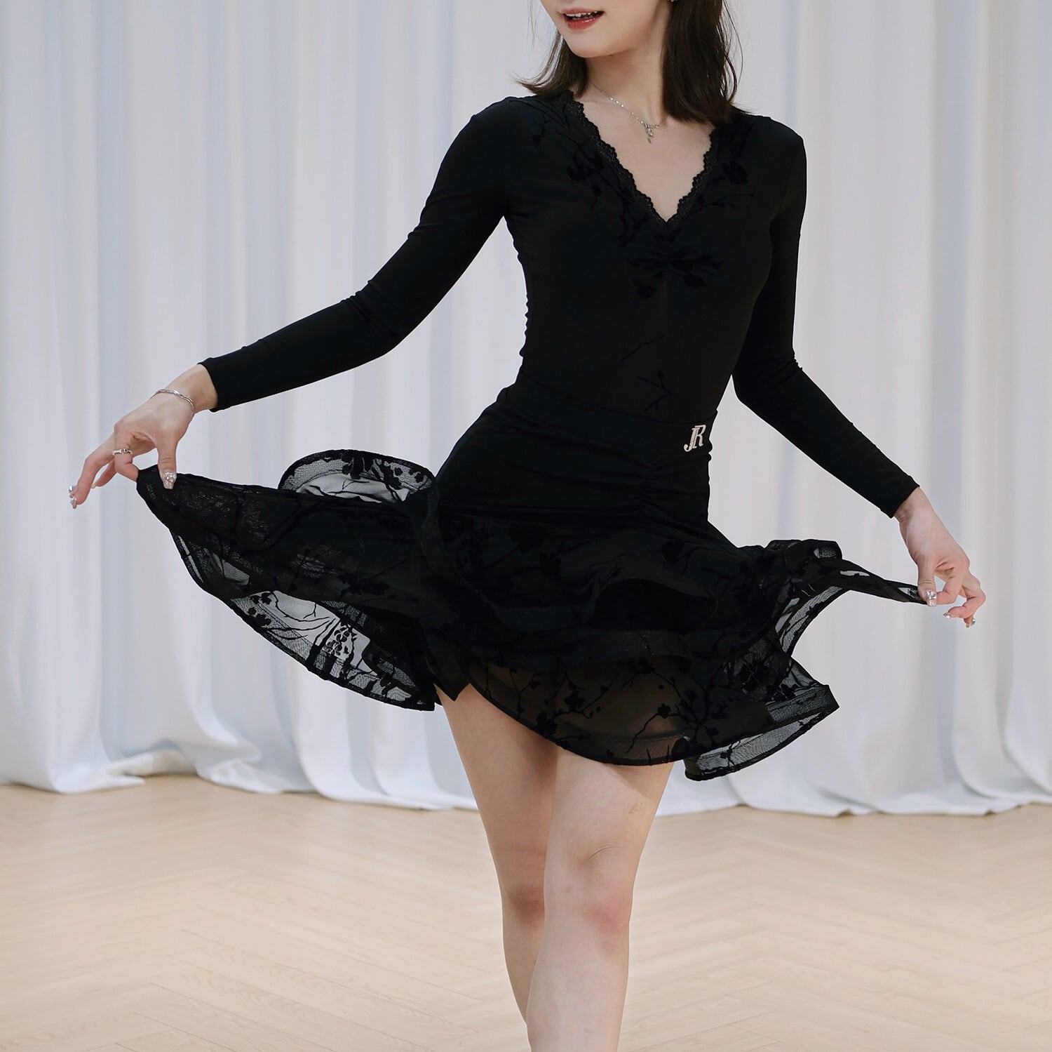 踊るたびに視線を奪う、ドレープとフリルが織りなすエレガントなシルエット。