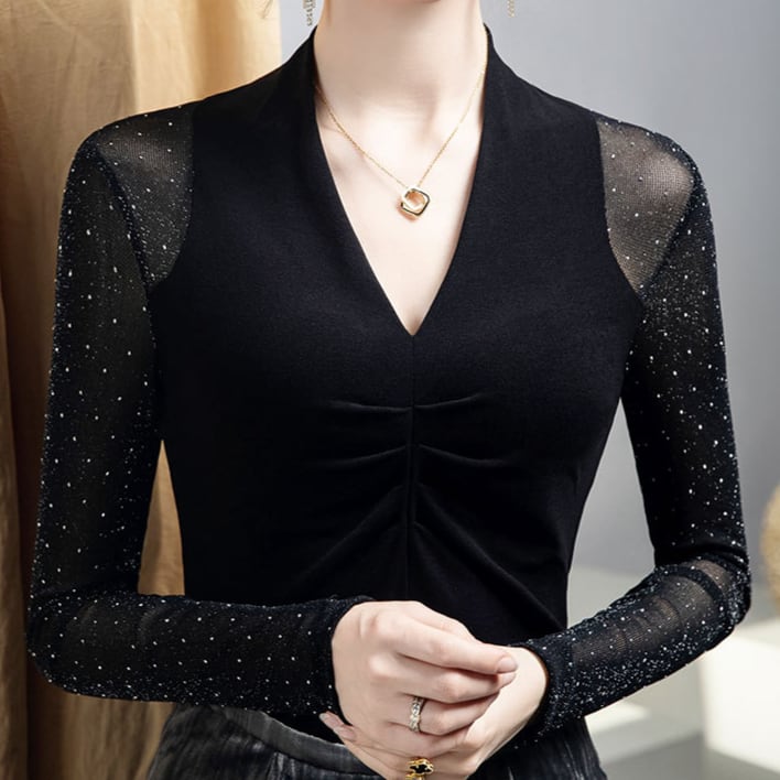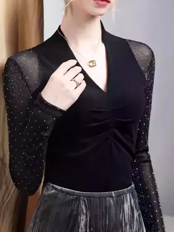袖のドット柄と透け感が目を惹く、Vネック長袖ダンストップス。