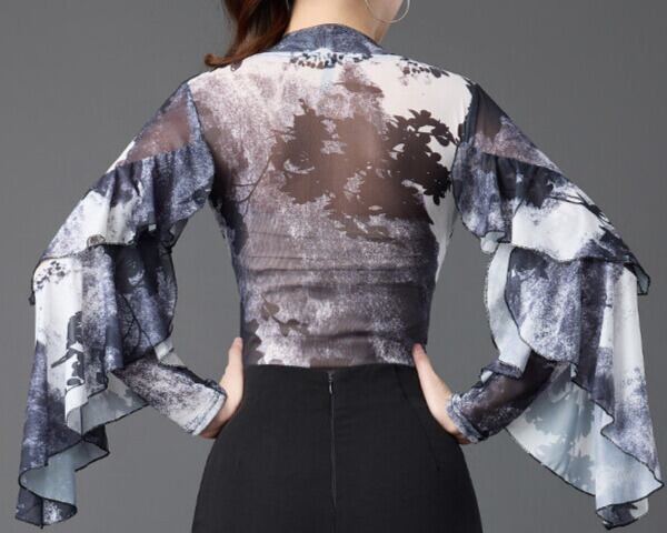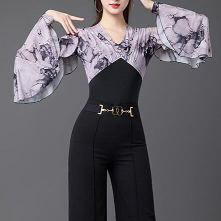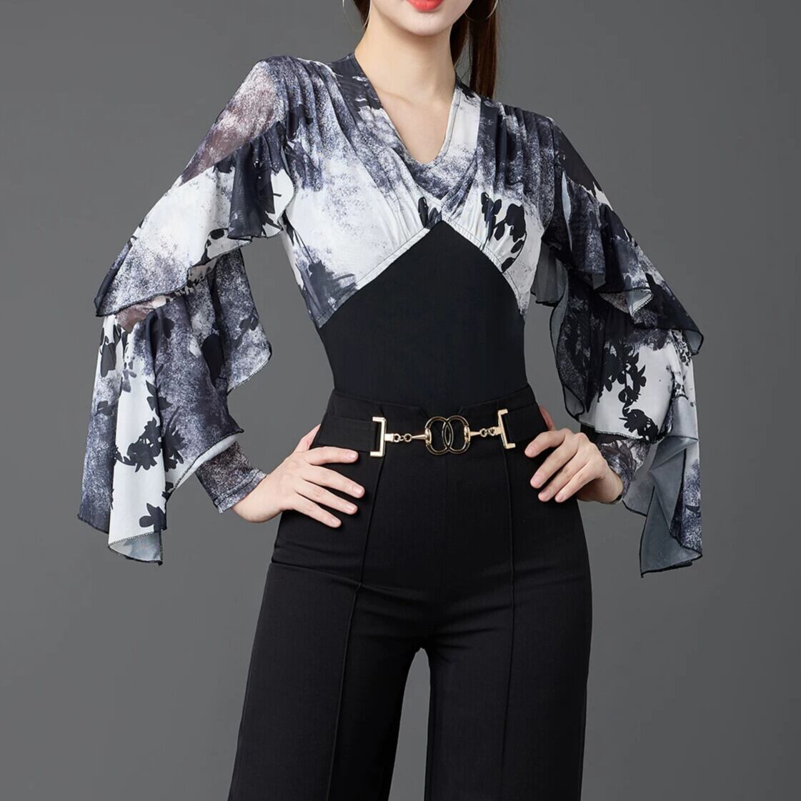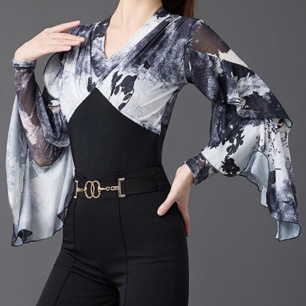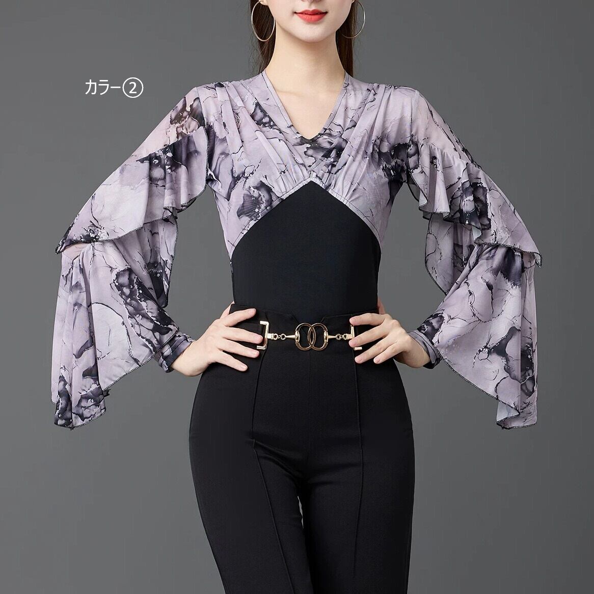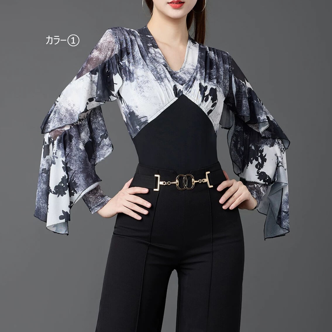 Vネック フレアスリーブ フリル トップス (レオタードタイプ) ds1471