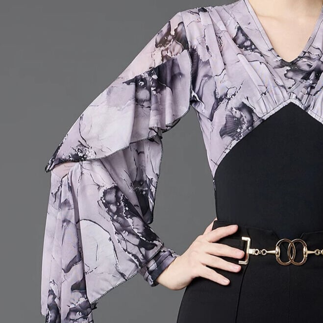 レオタードタイプなので、ハイウエストのボトムスと合わせればスタイルアップ効果も期待できます。袖のフリルが動きに合わせて優雅に揺れ、ダンスのパフォーマンスをより一層華やかに彩ります。