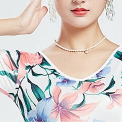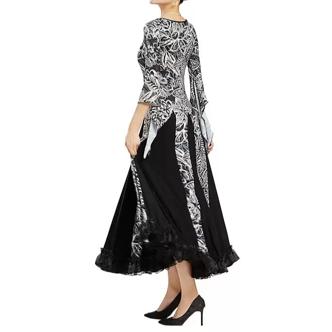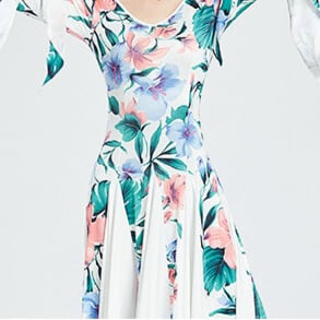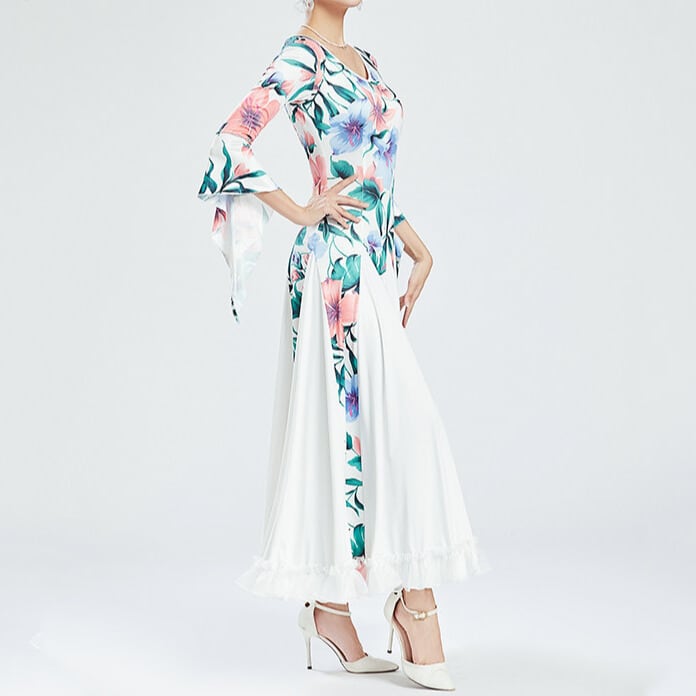 華やかなフラワープリントが目を引くミモレ丈フレアダンスドレス。