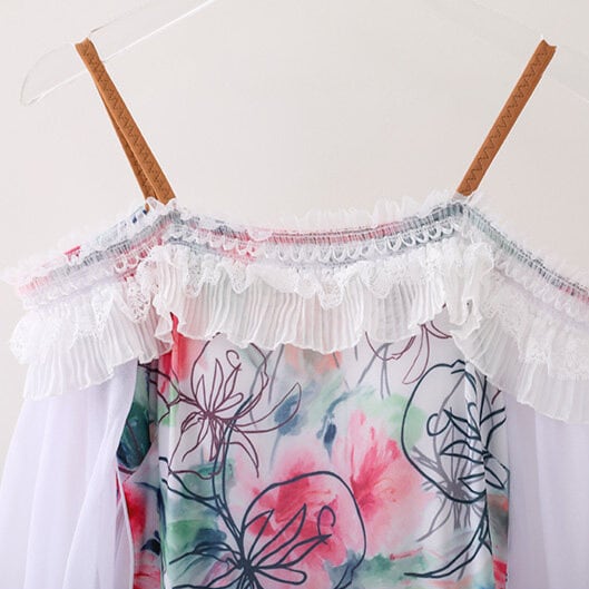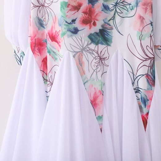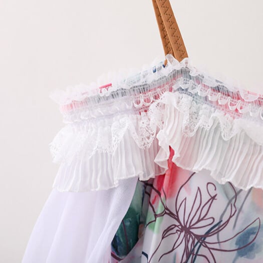 上身頃には繊細なフラワープリントをあしらい、柔らかなホワイトスカートとのコントラストが上品で華やかな印象を演出します。