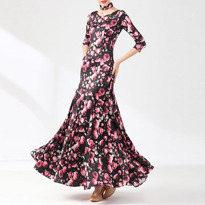 全体に散りばめられたフラワープリントが目を引くマキシ丈ダンスドレス。