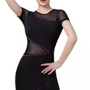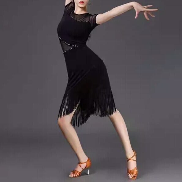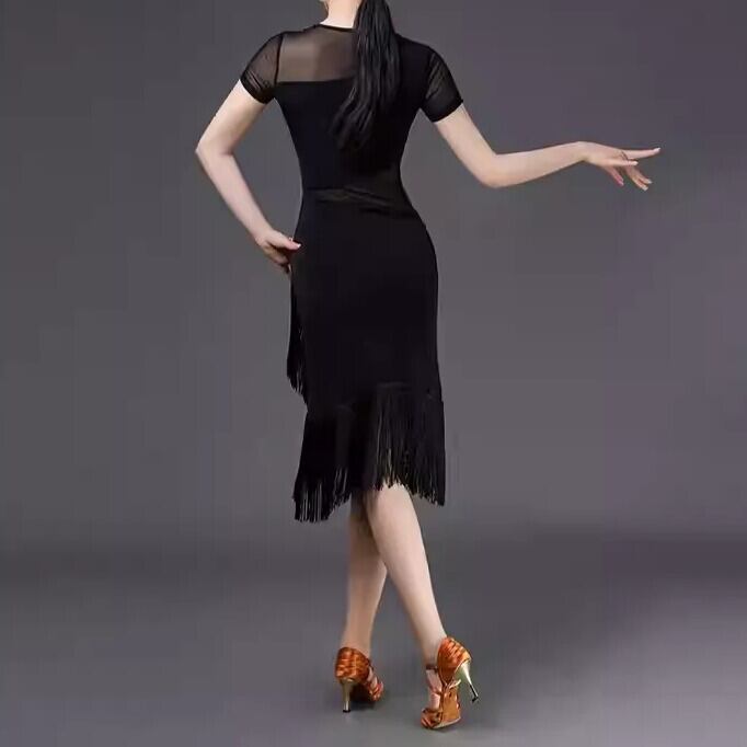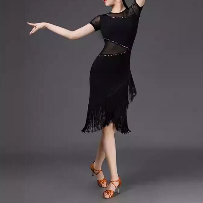 ボディラインを美しく引き立てるフィットシルエットに、胸元とウエストのシアーメッシュ切替を組み合わせた、洗練されたラテンスタイルの社交ダンスドレスです。斜めに入った切替ラインがウエストをすっきり見せ、さりげないストーン調ディテールが華やかさをプラス。裾にはたっぷりとフリンジをあしらい、ターンやステップのたびに軽やかに揺れて、踊りの動きをより印象的に演出します。チャチャ、ルンバ、サルサなどのラテンダンスはもちろん、練習着、発表会、デモ、ステージ衣装にもおすすめの一着です。