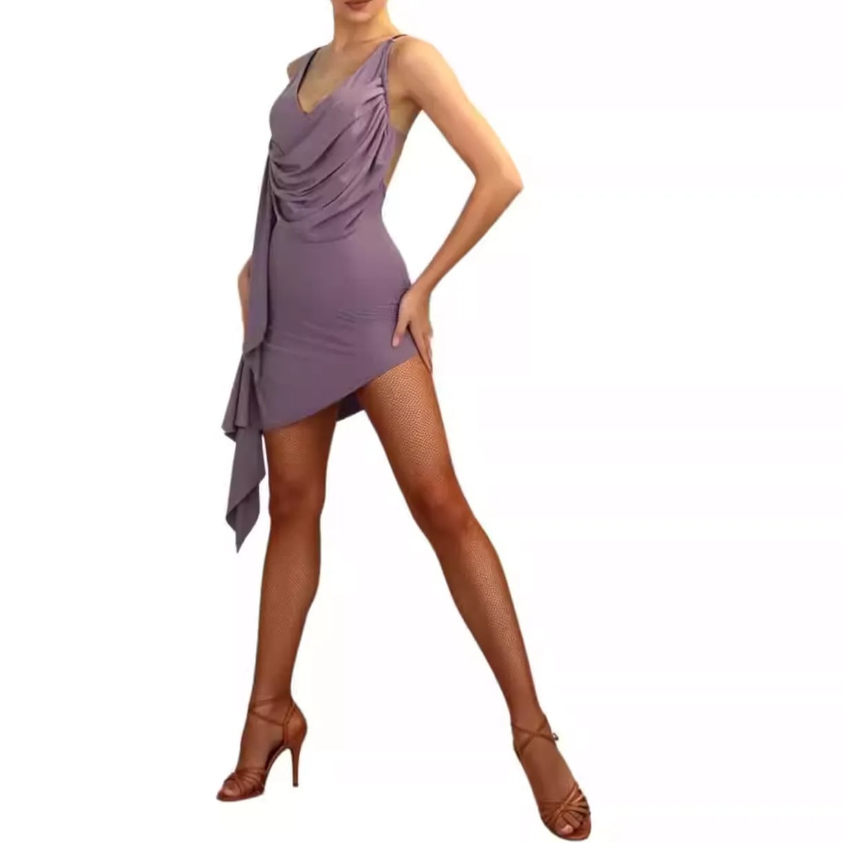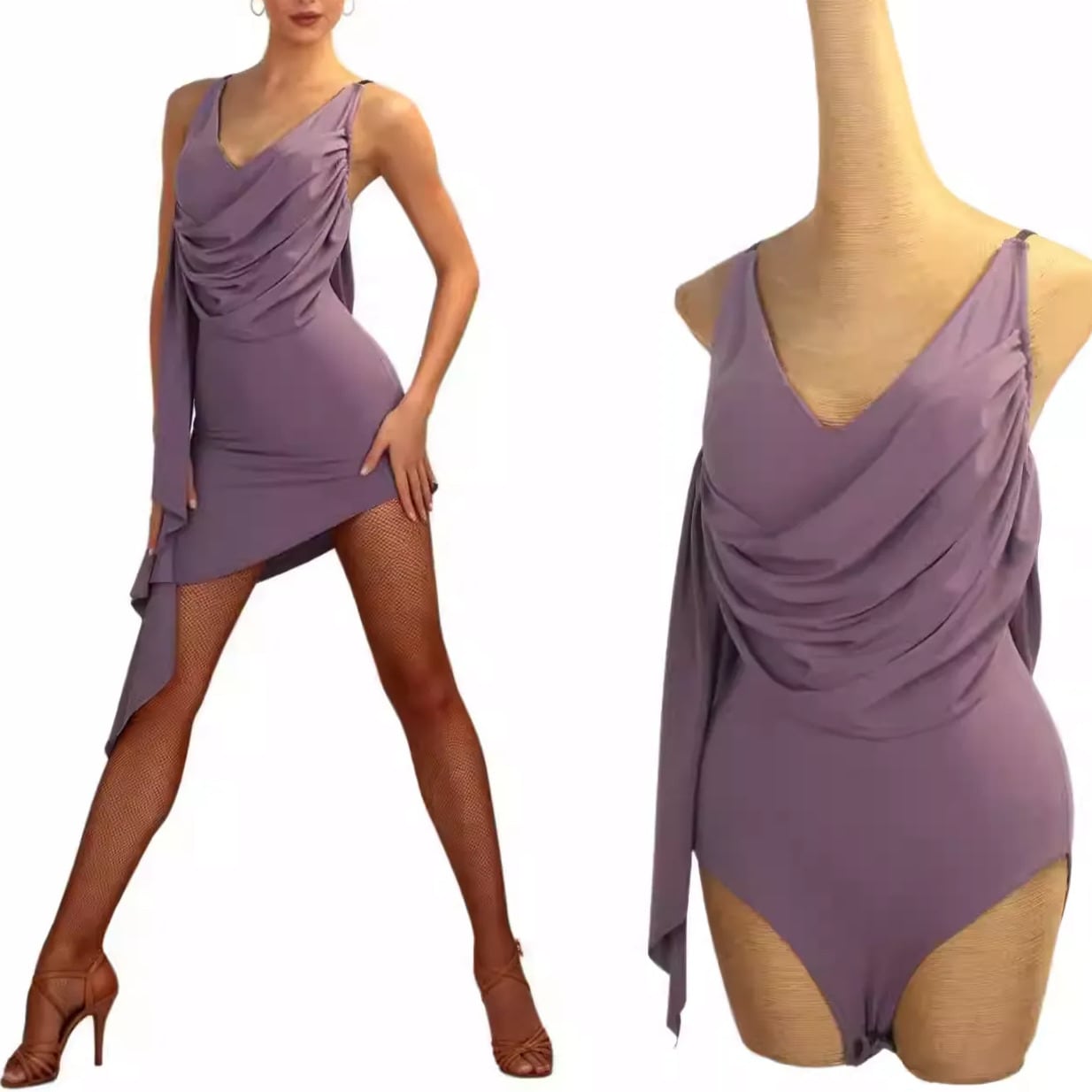 片側に流れるドレープデザインが動きに優雅な表情をプラスし、踊るたびに視線を惹きつけます。