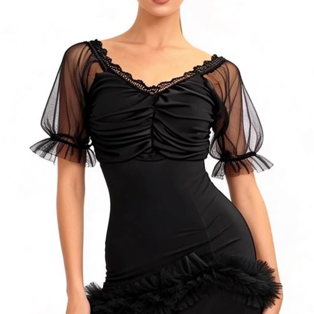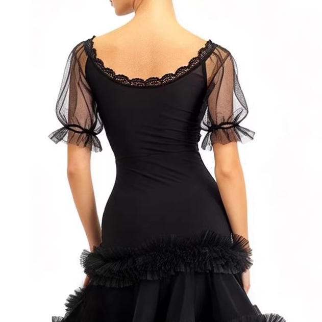 袖のシアーな素材が軽やかさを演出し、パーティーシーンに華を添えます。