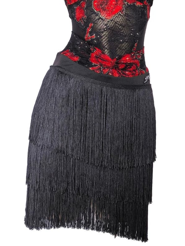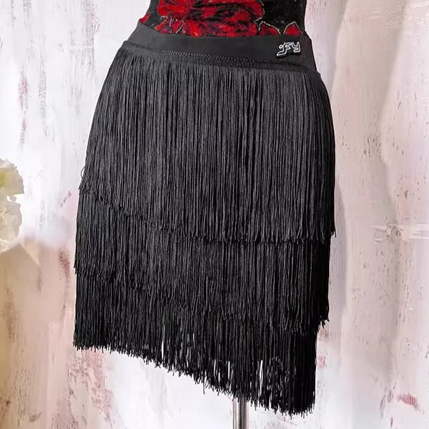 ホルターネックがデコルテを美しく演出し、裾のフリンジが動きに合わせて軽やかに揺れ、ダンスシーンを華やかに彩ります。