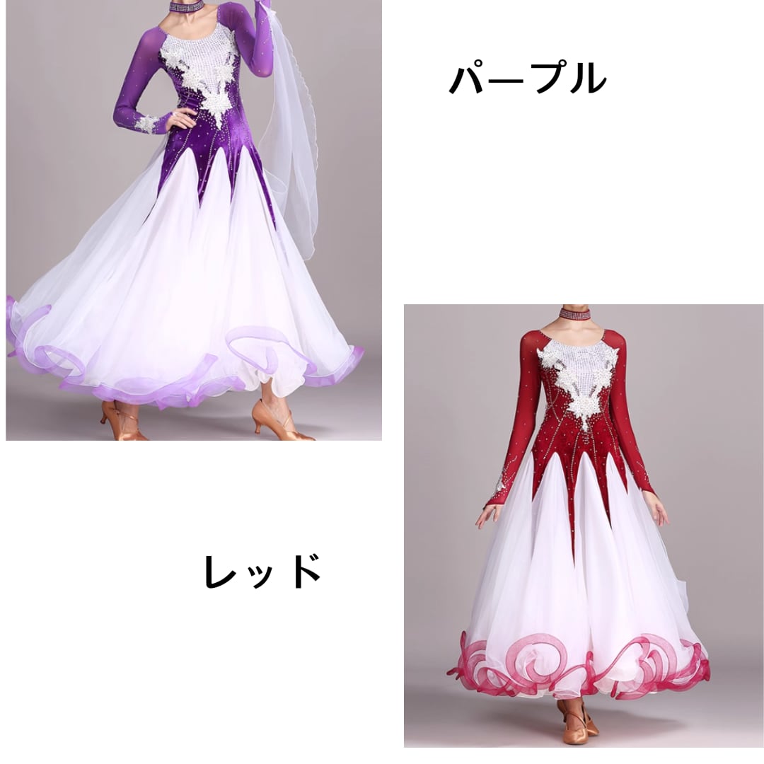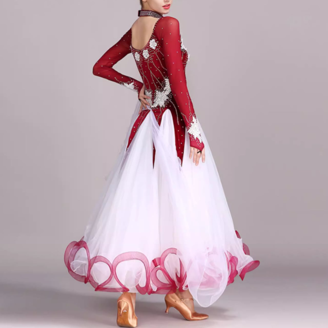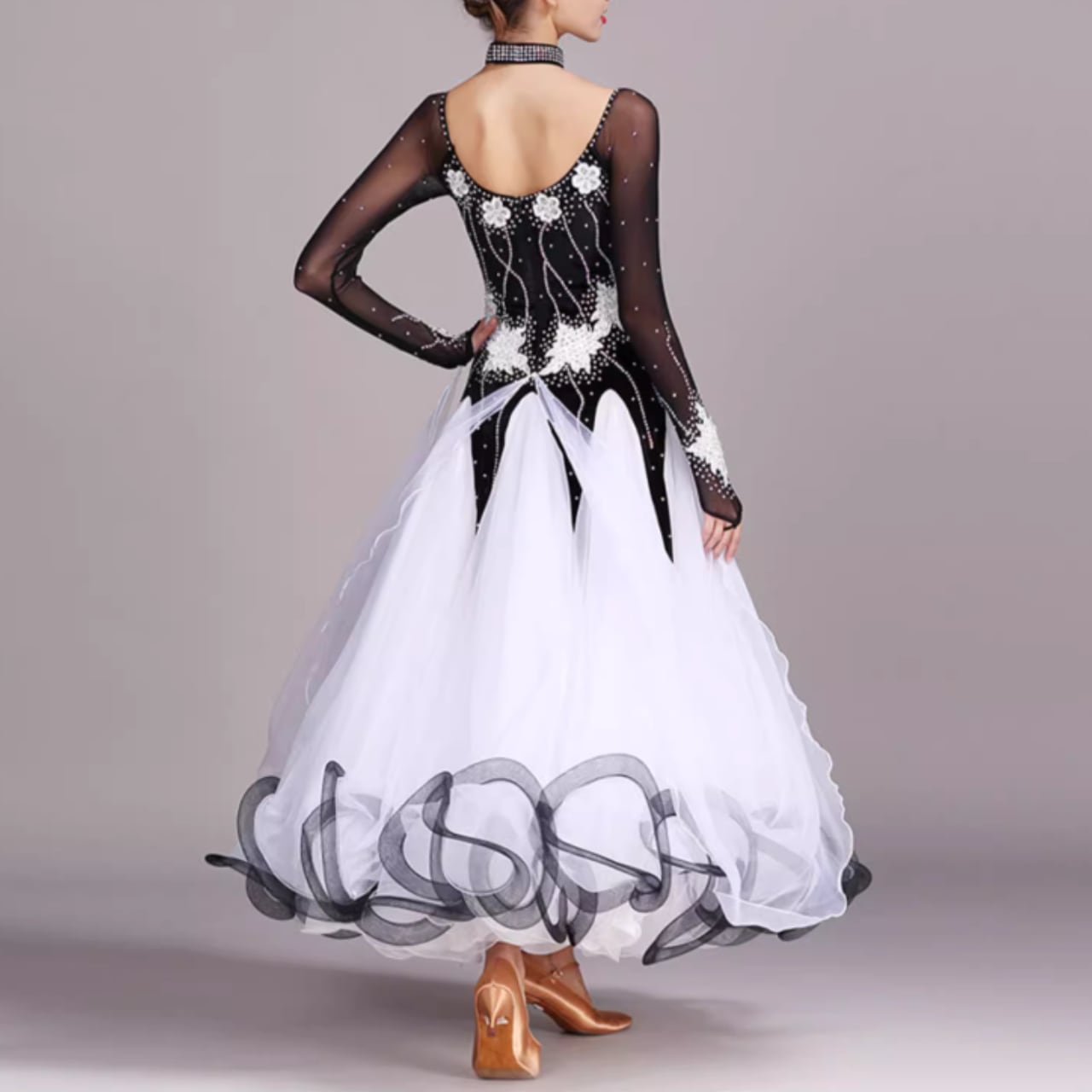 深みのあるカラーと純白チュールの組み合わせが、踊るたびに優雅なコントラストを生み出します。胸元から広がる繊細なラインストーン装飾が光を受けて輝き、上品な存在感を演出。