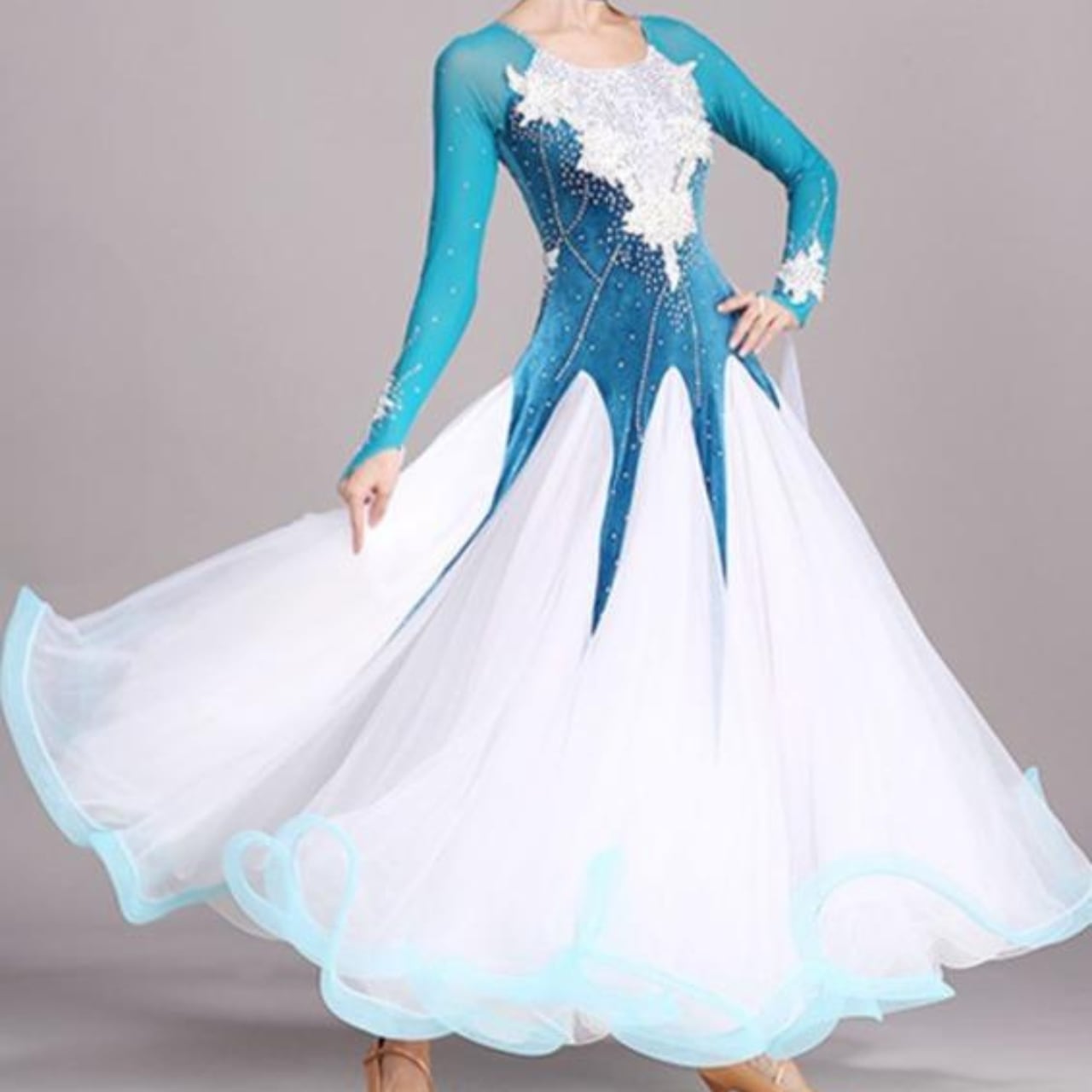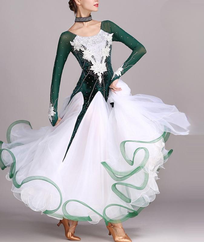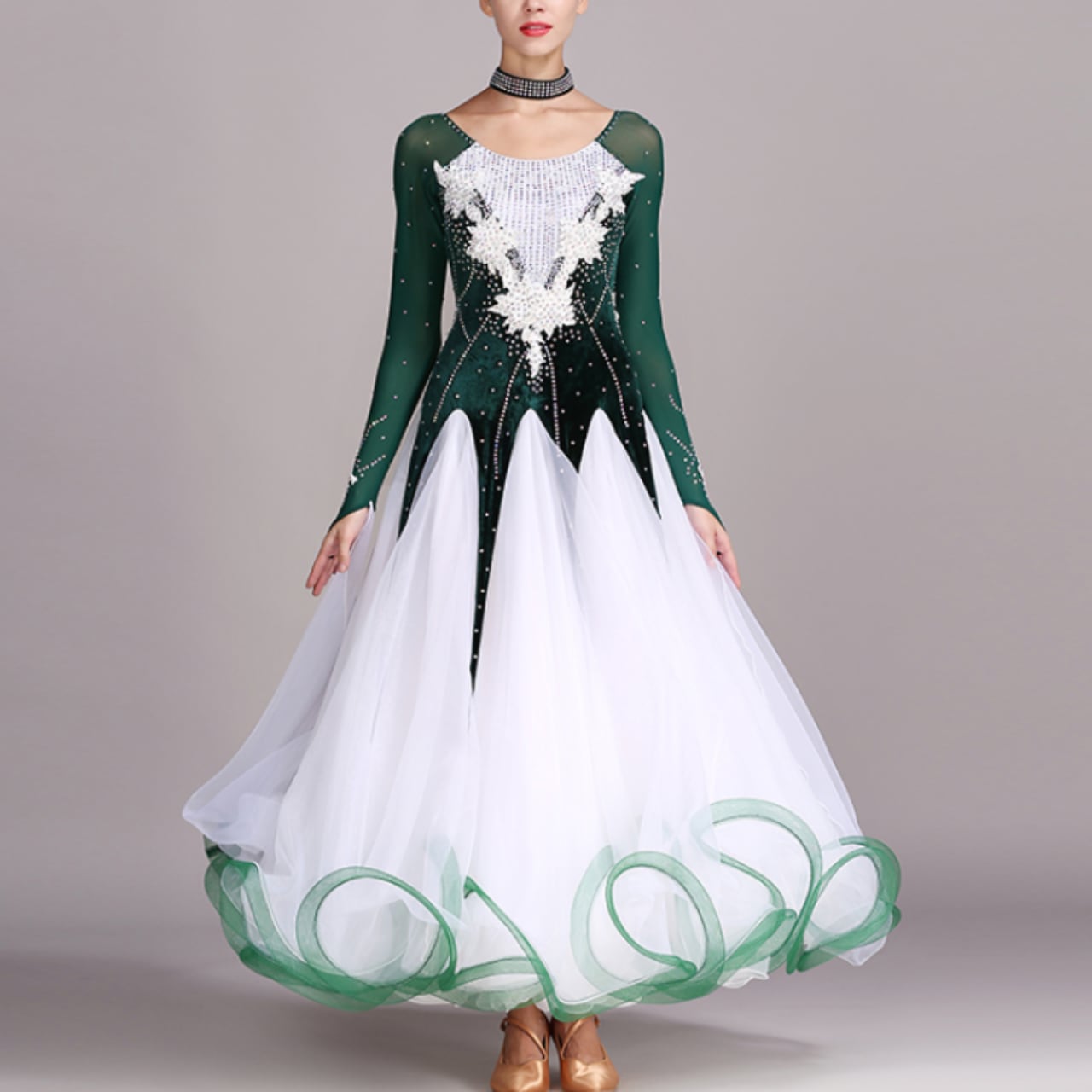 深みのあるカラーと純白チュールの組み合わせが、踊るたびに優雅なコントラストを生み出します。胸元から広がる繊細なラインストーン装飾が光を受けて輝き、上品な存在感を演出。